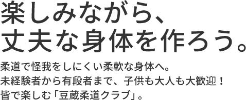 また、大人の方には柔道を通じて、強く柔軟な体を作り、汗を流して楽しい仲間作りができるようにしていきます。是非、道場見学にいらして下さい。